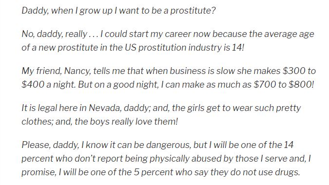 To argue against the decriminalization of sex work and to infantilize escorts to the point of arguing that arresting us is what’s best for us, people will talk about how dangerous it is to engage in prostitution. It is common for those who argue for the Nordic Model for sex work, or who want to keep it criminalized, to discuss the trauma that many sex workers experience in graphic detail as an emotional argument. I have seen people invoke the idea that young girls don’t grow up wanting to be sex workers, to get people to have an extreme negative reaction because of the association between children and sex work.