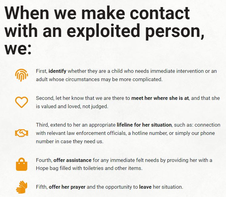 Exodus Cry, for example, offered “restoration programs” in the past as part of their outreach. According to their 2017 Annual report, these were phased out and they began referring sex workers to other groups and now only offer advice and prayer and gifts which consist of toiletries and Christian texts/pamphlets.