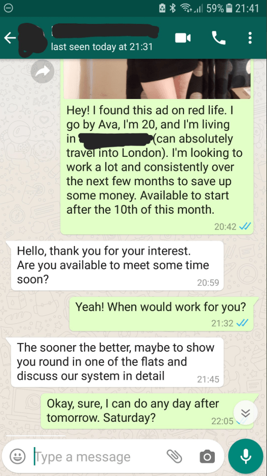 When I was 20 (pre-transition, presenting myself as a cis woman), having been selling sex already for 3 years independently, I decided to seek out brothel work. I badly needed money, so I used a site to find an agency or brothel near myself. I responded to an ad, offering premises and clients and suggesting that working there you could earn up to £500/day if properly motivated. I assumed I’d be earning less, but even if I could earn half of that in a day and do that for a week, my money issues would be vastly improved. By the end of the messages I’m posting here, I was working there, and I did so for a few months on-and-off.