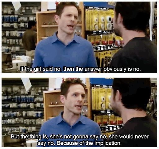 There’s a popular segment from Always Sunny in Philadelphia (which people have made endless memes of) where Dennis details how he gets women to have sex with him on cruises or in similar settings. He details how he respects if they say no, but that he creates a situation where they wouldn’t say no because of the “implication” of what he would do to them if they did.