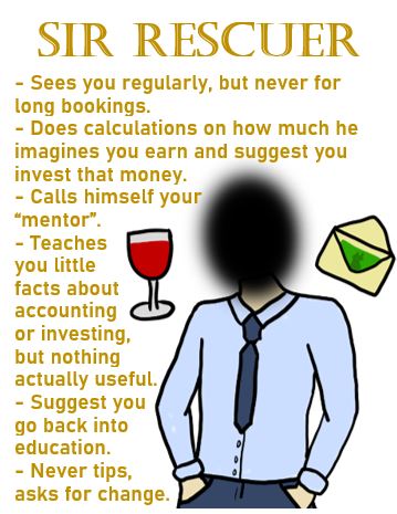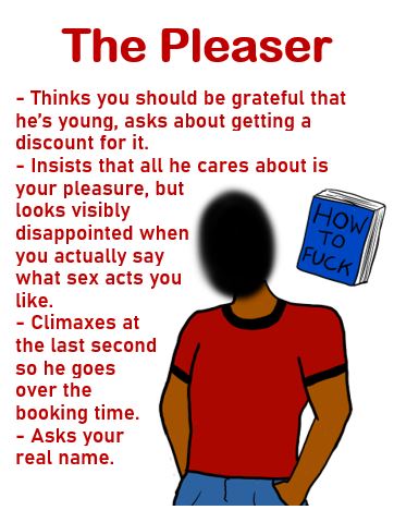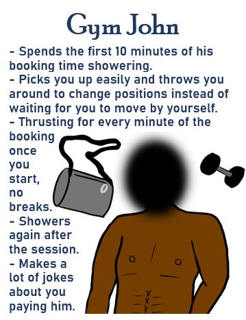 Personally, when I look at a man and imagine him as a client, it’s not exactly that I think he already is one. It’s that I could imagine him becoming one so easily. I can picture him browsing escorting sites after a few months of his wife not having sex with him, or after a divorce where he’s not ready for a new relationship yet, or as a way to act out kinks his boyfriend doesn’t want to indulge in.