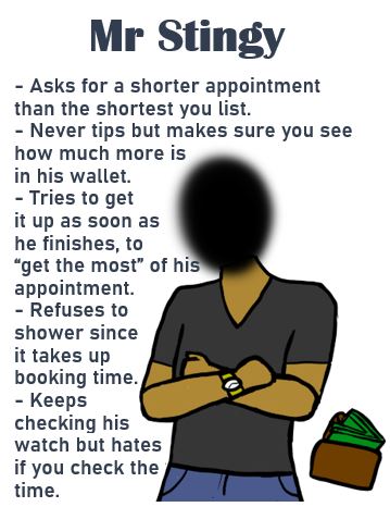 I have found that rich clients tend to feel more entitled to you, clients who use a lot of drugs and alcohol tend to be more unpredictable and likely to engage in more sudden acts of violence or verbal abuse, and that younger inexperienced clients tend to be extra objectifying. With most of my clients though, they are men who are extremely unremarkable. They’re the sort of men I’d see walking along the street in my daily life, who usually tell me their reason for paying for sex is discretion since they’re married or convenience since they’re not currently looking for a relationship and want no strings attached sex.