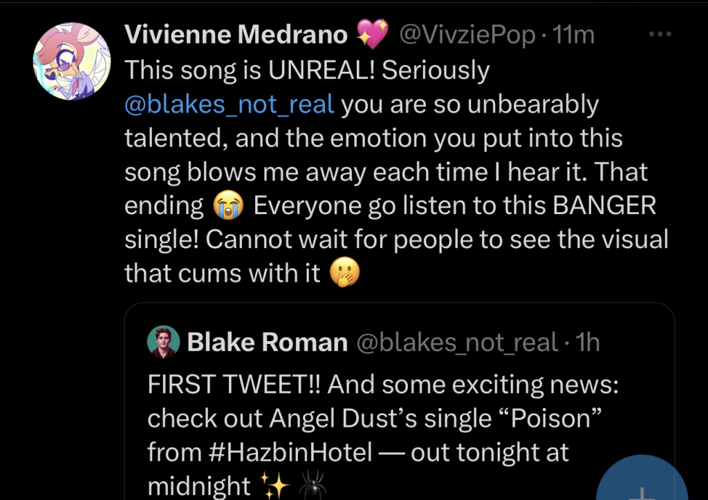 Vivziepop, the creator of Hazbin Hotel, advertised the music video by making sex jokes rather than by talking about how heart-wrenching it is. And of course she would, because it’s good advertising and the music video is intentionally sexual and meant to arouse to some degree!
