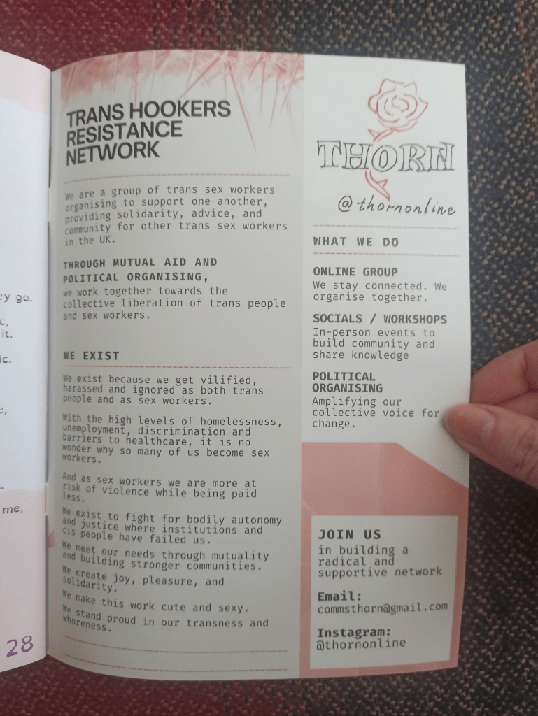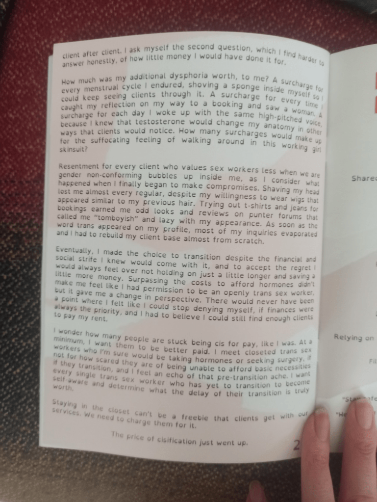 SWARM and THORN recently collaborated on putting together a zine, entitled Nuance Doesn’t Pay the Bills – a work of poetry, prose, and essays from trans sex workers! I was lucky enough to be asked to write a piece for it, The Price of Cisification which I’ve included below. It’s all about the costs associated with pretending to be cis while selling sex as a trans person.