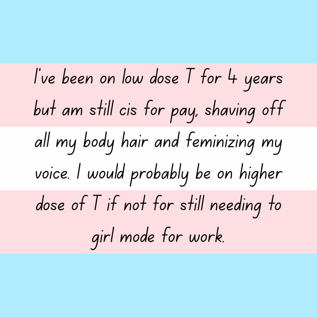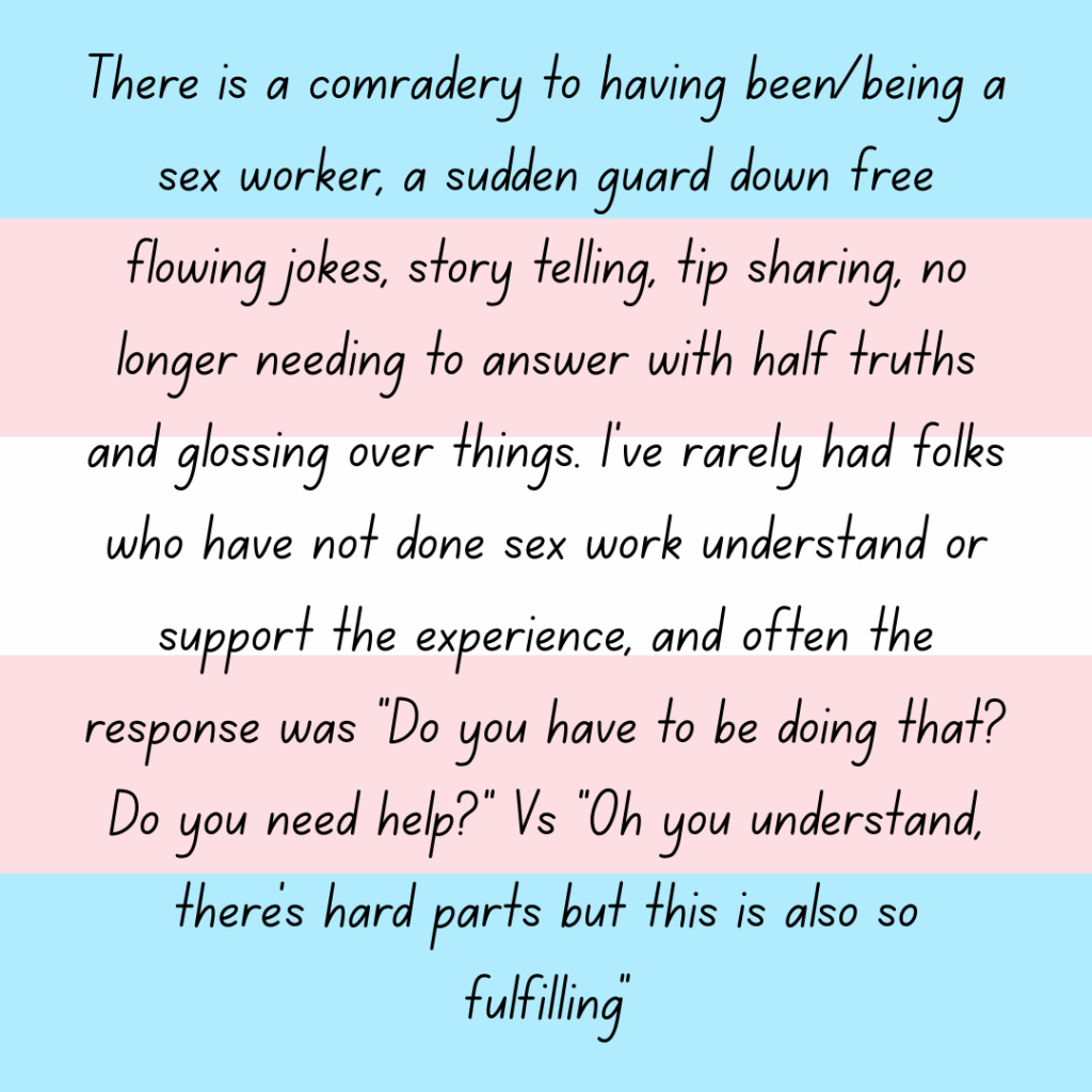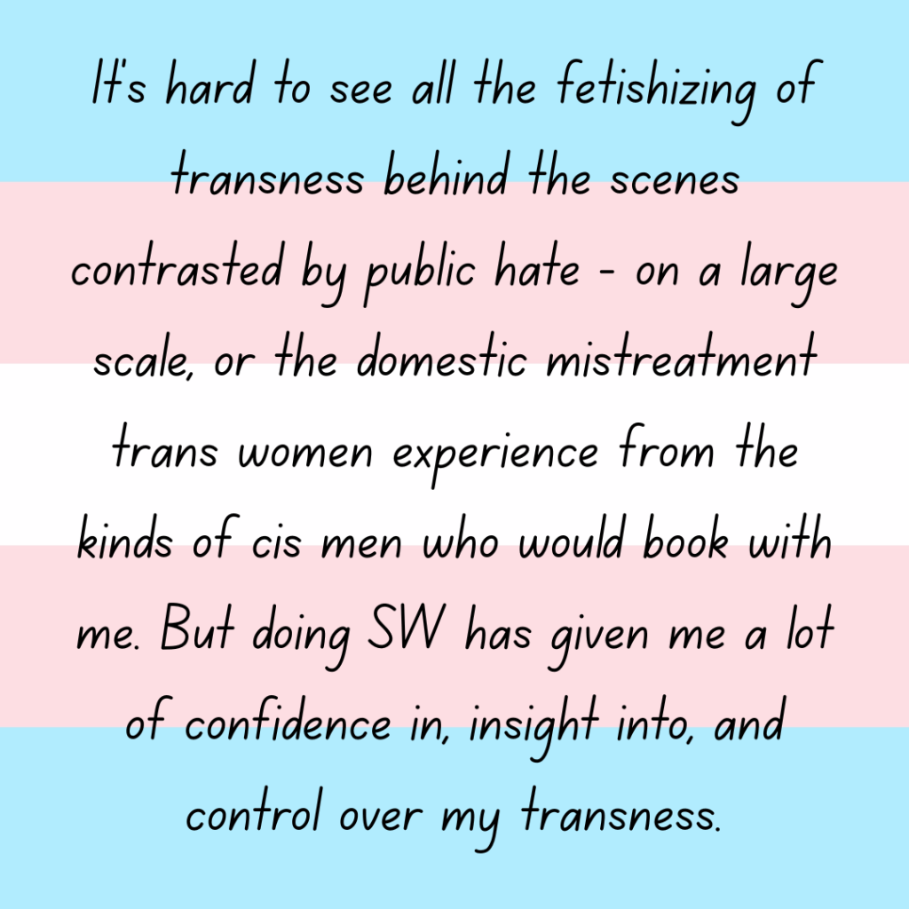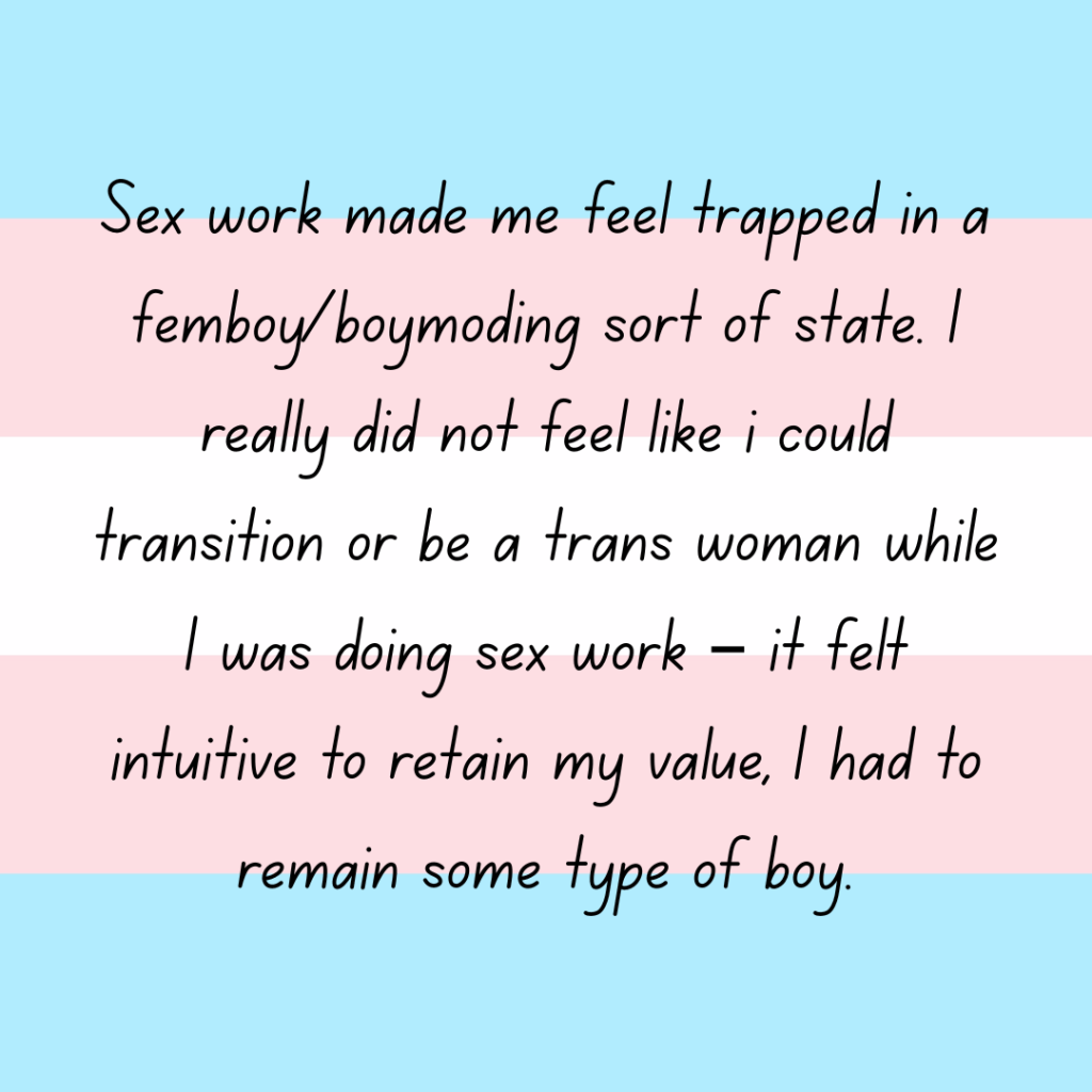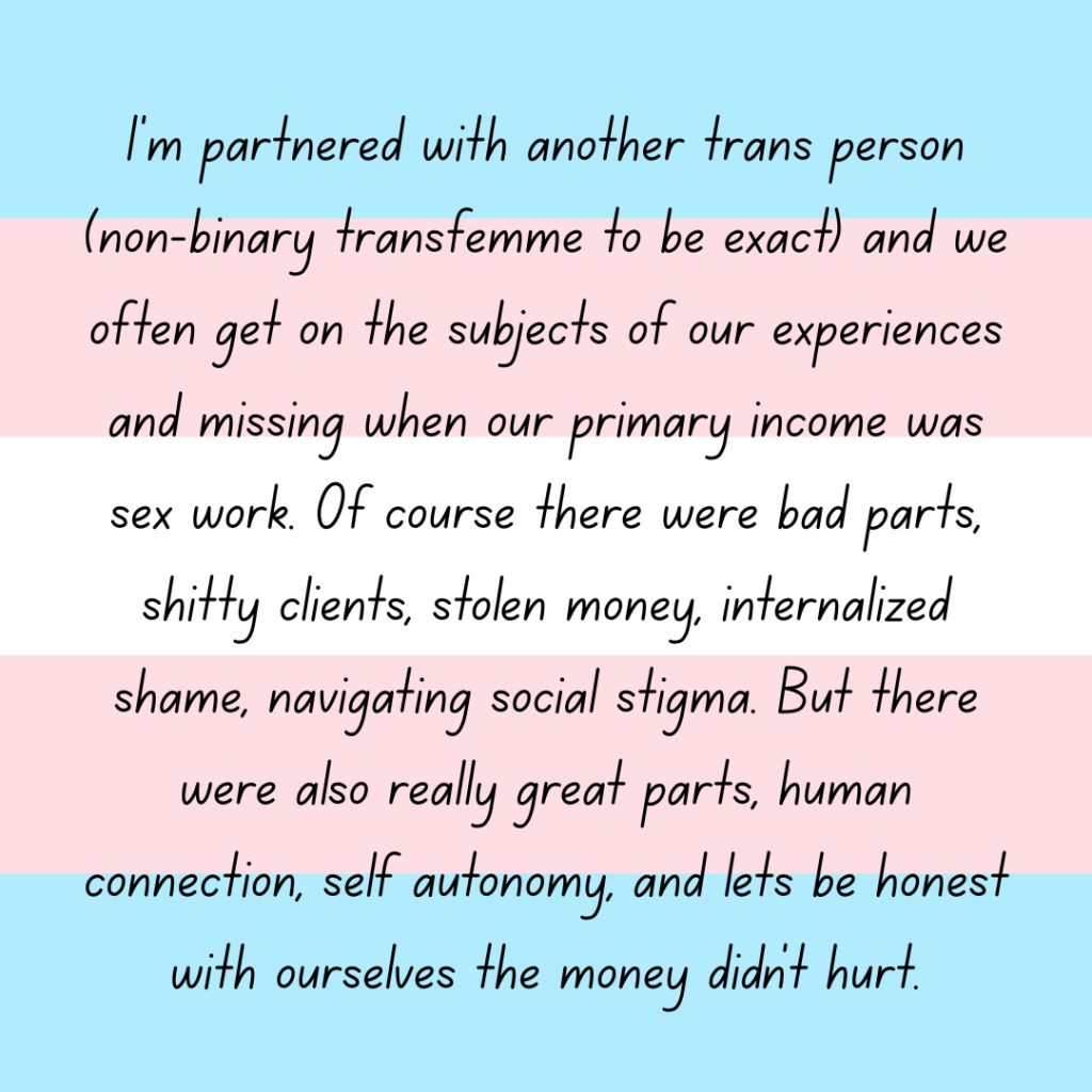 “I originally began sex work at 18, pre-transition playing the part of a young enthusiastic girl. I knew I was trans, but it was easy to sidestep at the time. There were a few years between beginning testosterone, and it really being difficult to hide where I could still glam it up and play the part, though eventually it was game over after top surgery. —- There was a phase early on where I could still pass as a woman for sex work, where my day to day presentation was significantly more masculine. Baggy clothes, chest binding, short haircuts, even the occasional masculine contouring. These days my presentation is much more effeminate, with tighter clothing, makeup, accessories, even down the the lingerie I seek out. There are two arguments that could be made here, one being that as I’ve gotten older, more comfortable with my body (lack of dysphoria), I’ve become indifferent to gendered expectations of presentation and found joy in effeminate beauty. Then there’s the other argument which I had never put together until this moment, which may be that as I became undesirable or unable to play the part of a woman and all the glam, there might be a part of me that started seeking out in my general presentation day to day ways to feel and experience that desirability, the dressing up, the playfulness, the femininity that I was previously leaning into with sex work.”
