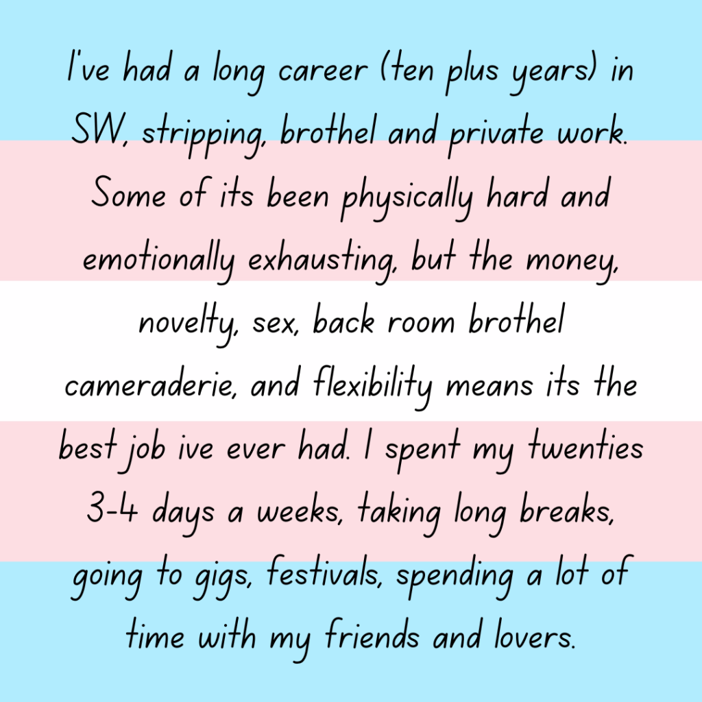 “i slept on the sidewalk or under bridges. i needed to eat. i felt like Elle Fucking Fanning in The Neon Demon, when she gives her speech about how beauty sells and people pay to look at her but that it’s all she has to offer anyone. i needed to do it to survive. it wasn’t about “connecting with human sexuality” or “liberating my sex positive self” or whatever other weird bullshit people tout to feel better. im an unemployable herm. i could get food for playing fetish for people on occasion, if i made sure to very carefully groom myself to be as conforming as possible – because me trying desperately to conform to high fem while having ambiguous genitalia was the only way anyone was ever attracted to me, in or out of sex work. this wasn’t a libratory choice this was survival. — if you never freshed up at the YMCA before taking a client, i don’t care about what you think of All Sex Work. it’s important to bring all voices to the table, but the second SWers who felt exploited/trapped/harmed by their work show up, everyone starts screaming and flipping out. we need decriminalization and destigmatization so that EVERYONE is safer & that includes people like me even if my version of sex work wasn’t #pussypower.”